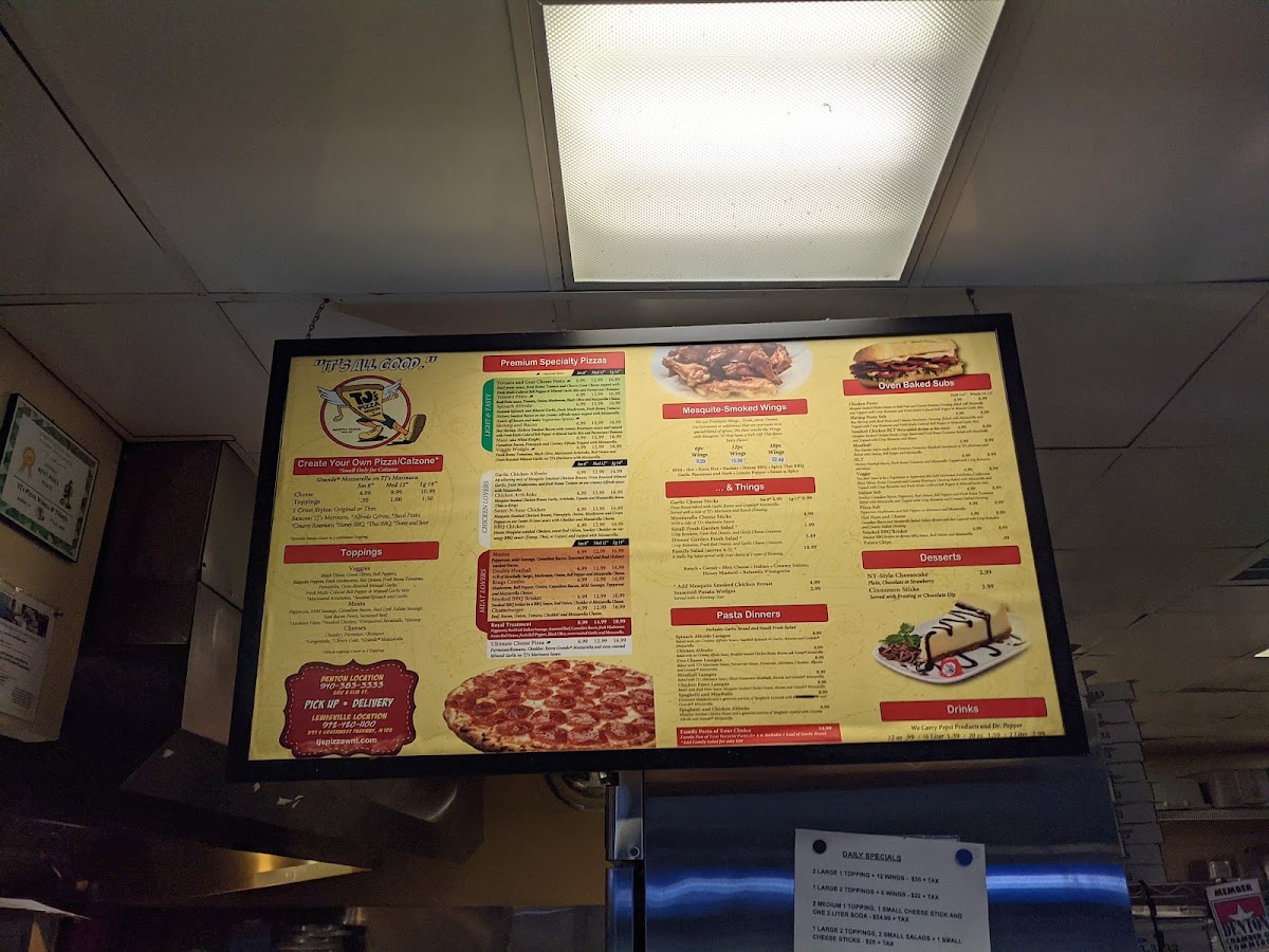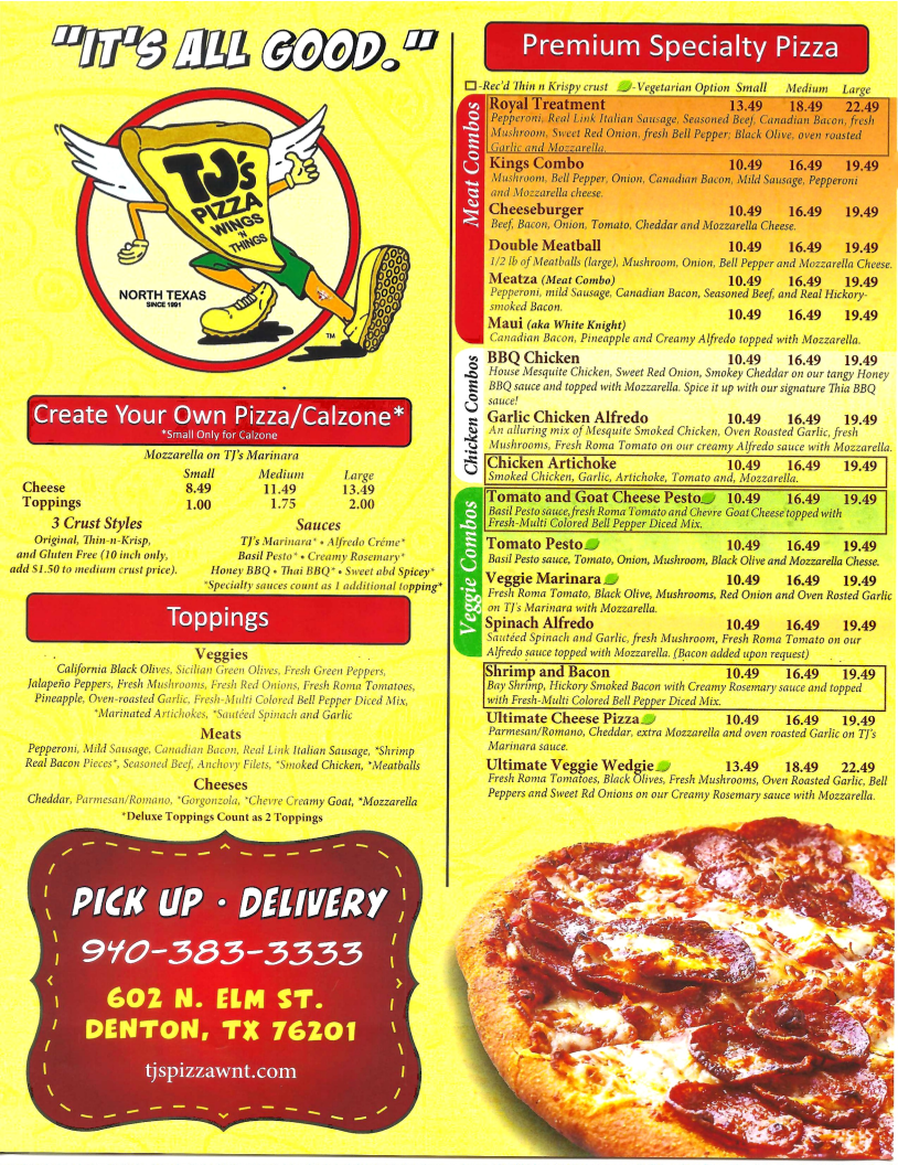 Introducing the menu at TJ's Pizza Wings N Things, a beloved Denton, TX eatery, is a delightful journey for pizza enthusiasts. Their customizable pizzas come in three crust styles: original, thinkrisp, and gluten-free, catering to varied tastes with sizes ranging from small to large (starting at $8.49). Creative veggie combos like the Tomato and Goat Cheese Pesto feature vibrant bell pepper salsa, while the Tomato Pesto melds rich flavors of mushrooms and black olives.
